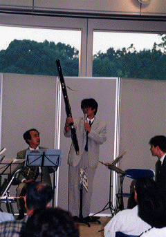写真は楽器の紹介をするファゴットの藤田旬。